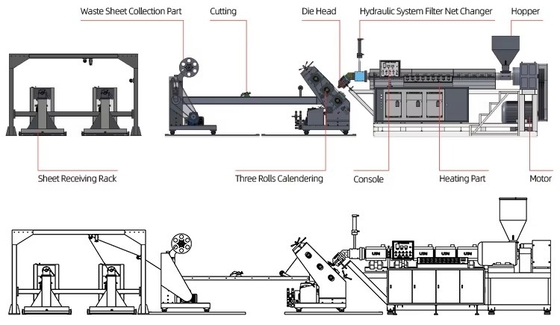 The sheet extruder is composed of extrusion, calendaring, traction, and rolling. The main parts are abrasion-resistant, resistant to corrosion, and high-temperature resistant due to high-quality, specially-treated materials. The low resistance force in the die head extruding channel ensures an even sheet thickness. The internal spiral tank, equipped with three rollers, provides effective cooling. Additionally, it is easy to change and install a net changer with the hydraulic pressure unit, eliminating the need to stop the machine. The machine extrudes PP/PS granules to a PP/PS sheet with a single color, which is used for producing plastic products by plastic thermoforming machines, like cups, food containers, trays, dishes, bowls, lids, etc.